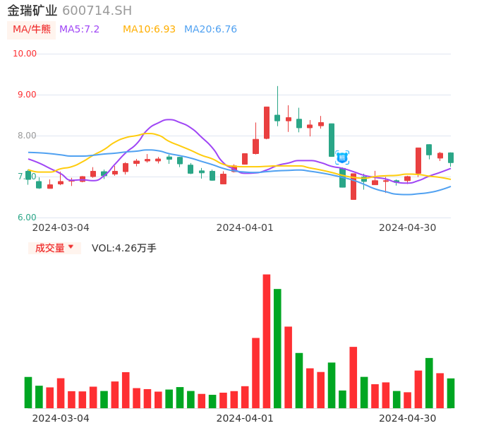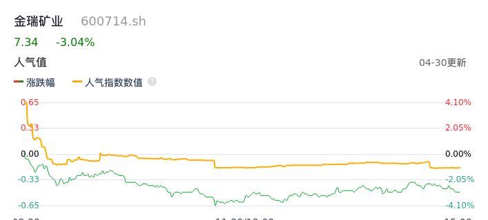 04月30日,金瑞矿业收报7.34,股价涨幅-3.04%,成交金额3149.60万元,换手率1.48%。