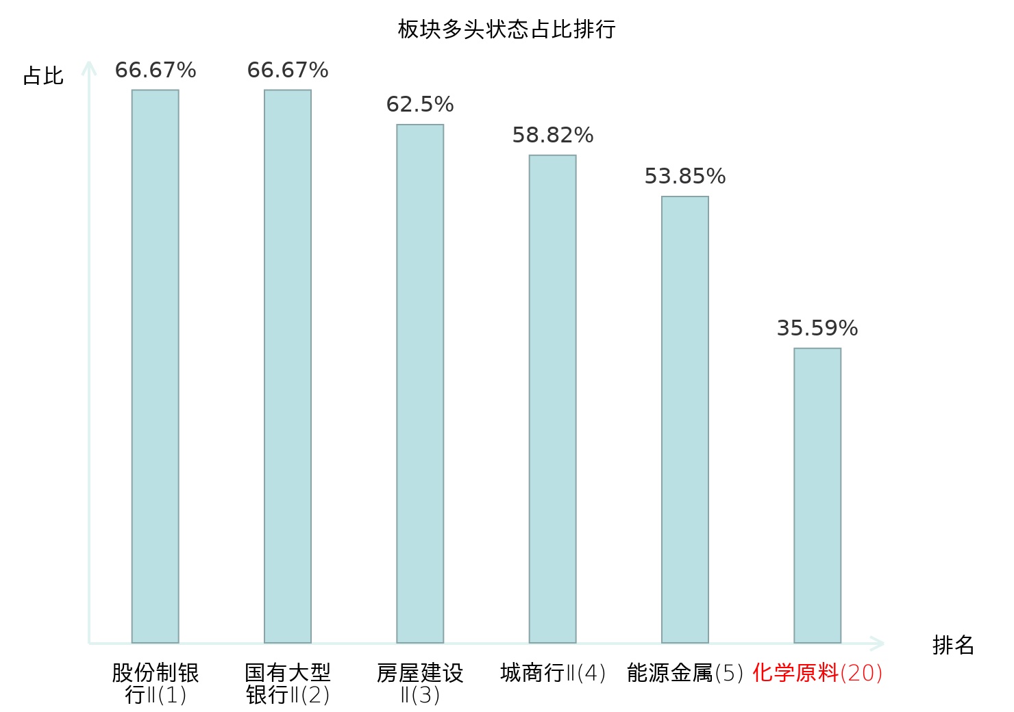 全市场所有行业板块中主力多头状态占比排名中,股份制银行Ⅱ板块位居第一。航空机场板块名次提升最快,较昨日上升68位。