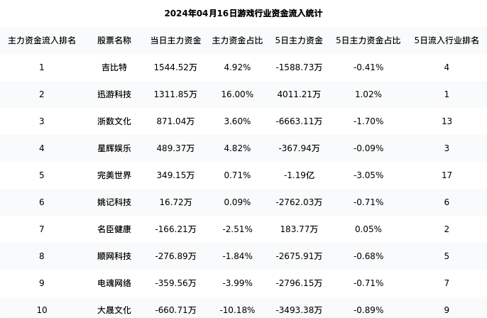 从主力资金流向来看,游戏行业今日主力资金流入26.76亿元,在所有申万二级行业中排名:67/131。