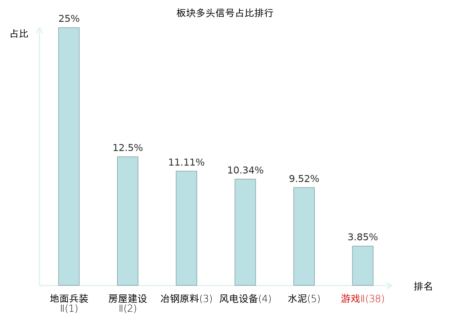 全市场所有行业板块中主力多头信号占比排名中,地面兵装Ⅱ板块位居第一。房屋建设Ⅱ板块名次提升最快,较昨日上升117位。