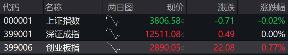 沪指跌0.02%,深成指平开,创业板指涨0.77%。盘面上,CPO、油气、AI手机板块涨幅居前,黄金概念、固态电池、PEEK材料等板块走低。