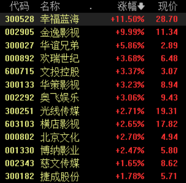 金逸影视涨停,幸福蓝海涨超11%,文投控股、华谊兄弟、华策影视、横店影视等跟涨。消息面上,根据国家电影局最新数据,2025年暑期档(6月1日至8月31日)总票房高达119.66亿元,观影人次突破3.21亿,其中国产影片票房占比达76.21%。