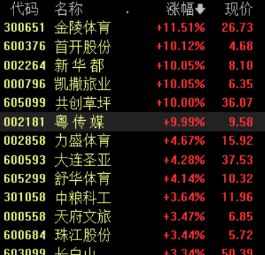 10:16体育概念盘中再度活跃,金陵体育涨超10%,粤传媒2连板,共创草坪、力盛体育、舒华体育等跟涨。消息面上,国家发改委表示,推动将发展体育产业和户外运动有关内容纳入“十五五”规划纲要和相关专项规划。