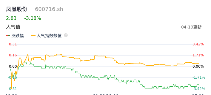 04月19日,凤凰股份收报2.83,股价涨幅-3.08%,成交金额2728.83万元,换手率1.01%。