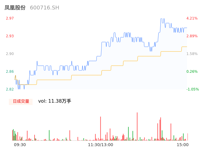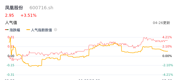 04月26日,凤凰股份收报2.95,股价涨幅3.51%,成交金额3307.14万元,换手率1.22%。