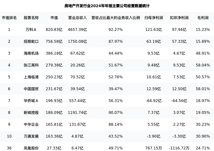 凤凰股份最新报告期数据为年报,下表汇总了房地产开发行业内市值靠前的公司年报主要经营数据