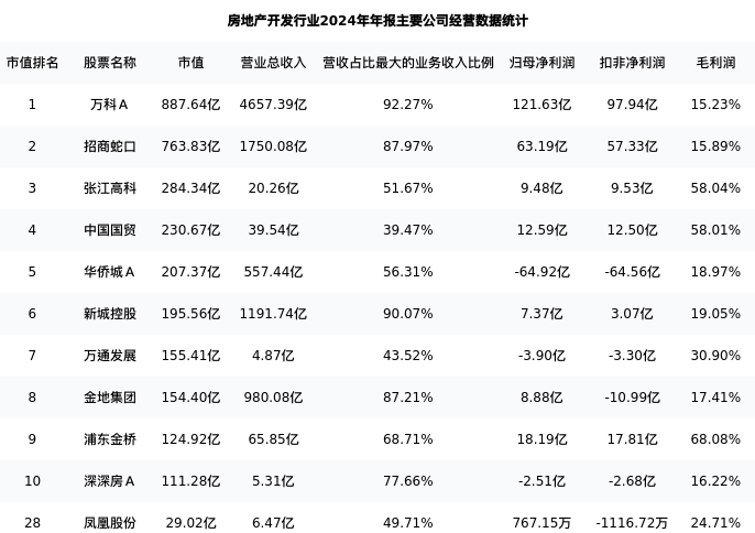 凤凰股份最新报告期数据为年报,下表汇总了房地产开发行业内市值靠前的公司年报主要经营数据