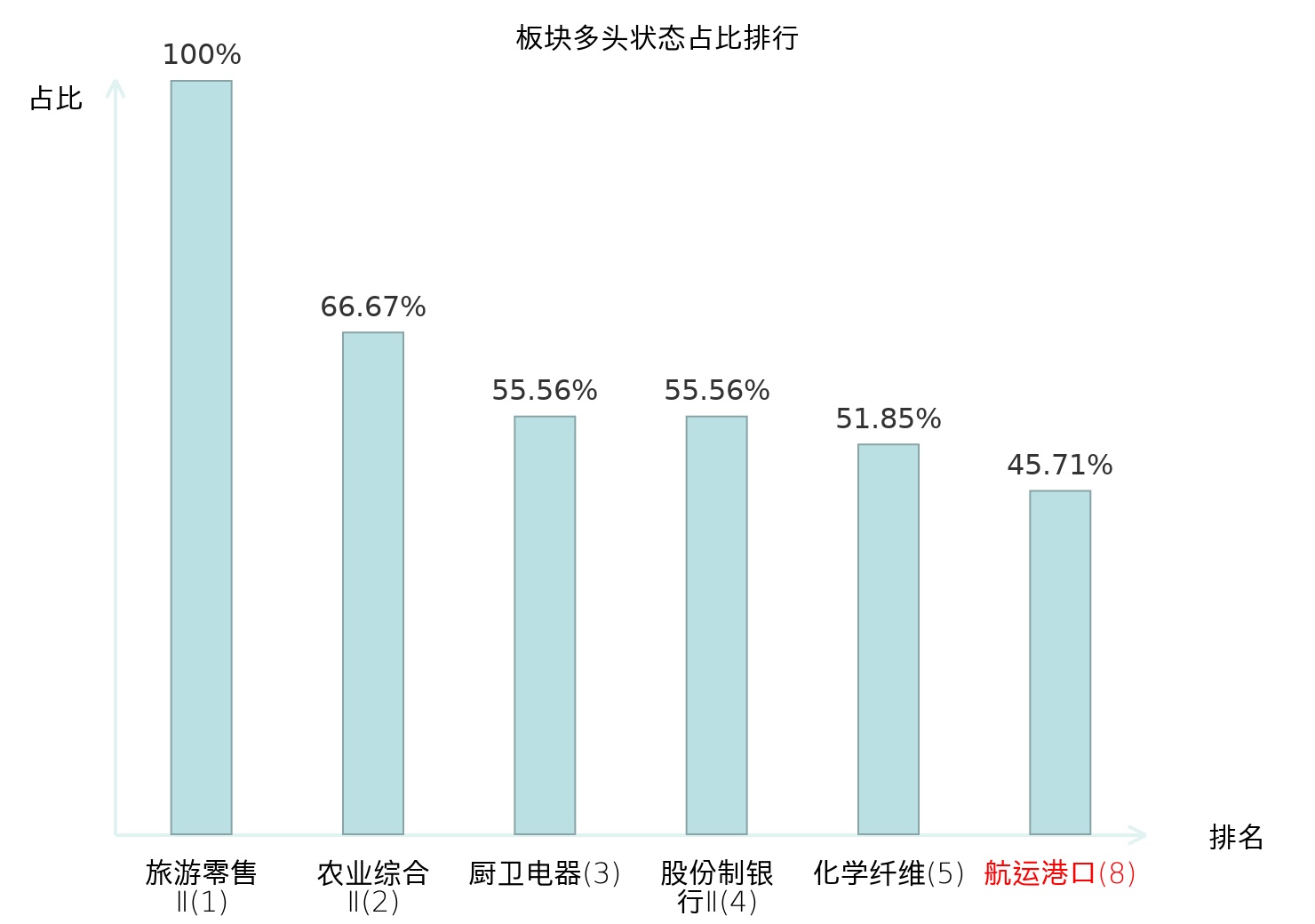 全市场所有行业板块中主力多头状态占比排名中,旅游零售Ⅱ板块位居第一。国有大型银行Ⅱ板块名次提升最快,较昨日上升103位。