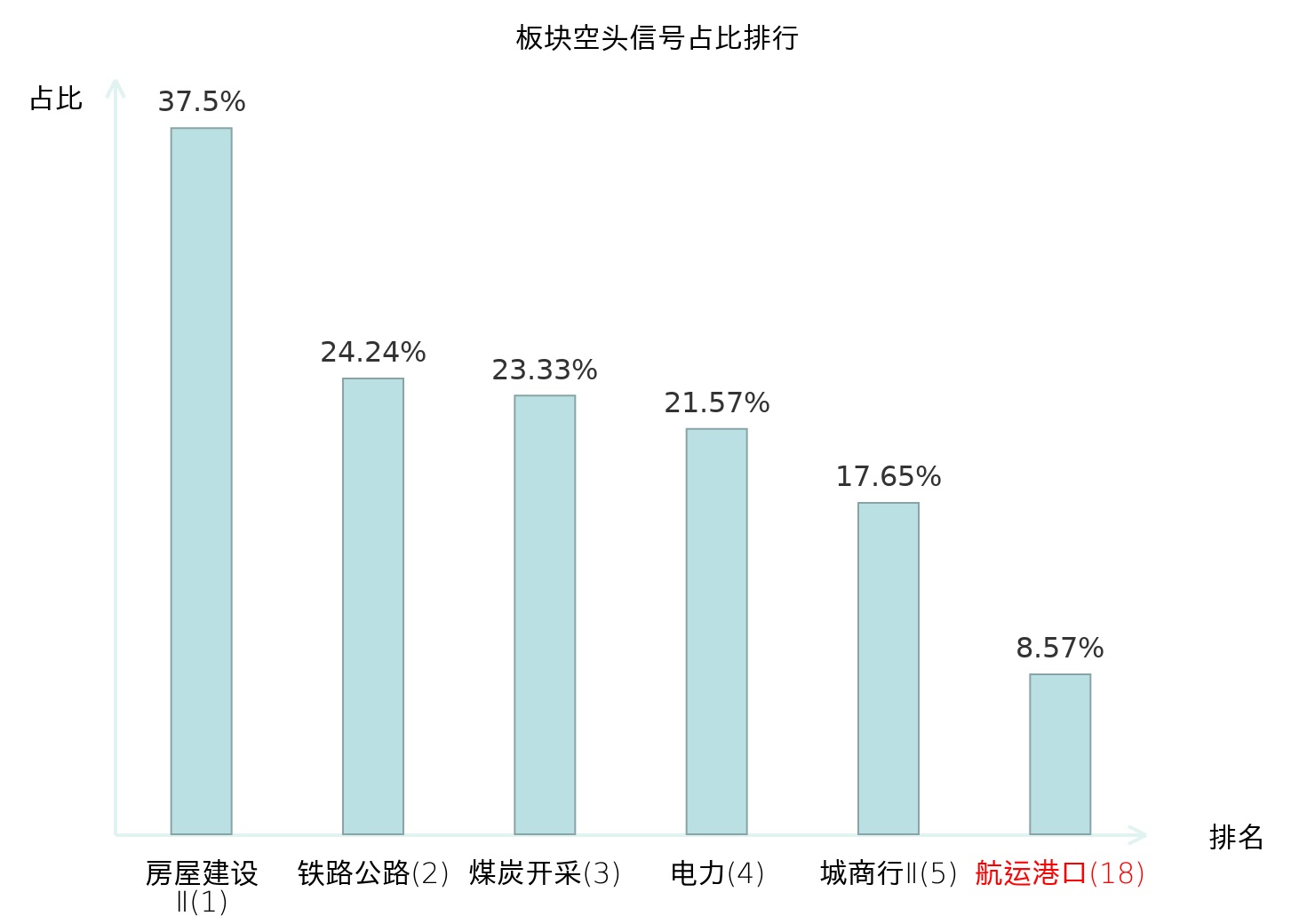 全市场所有行业板块中主力空头信号占比排名中,房屋建设Ⅱ板块位居第一。煤炭开采板块名次提升最快,较昨日上升117位。