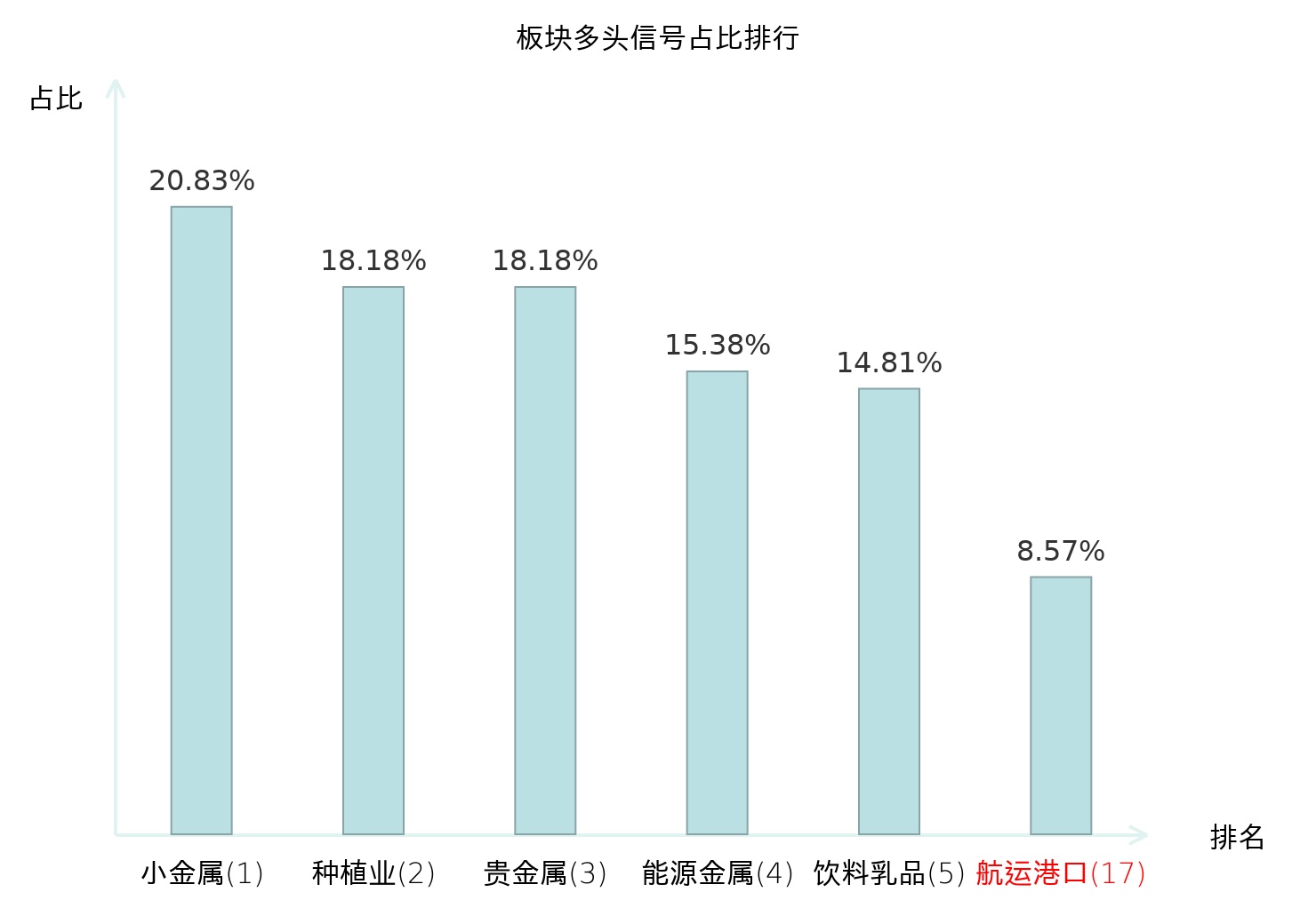 全市场所有行业板块中主力多头信号占比排名中,小金属板块位居第一。房屋建设Ⅱ板块名次提升最快,较昨日上升111位。