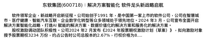 值得注意的是:2024年04月海通证券的杨林/杨蒙分析师,首次发布关于东软集团的研究报告,标题为:东软集团(600718):解决方案智能化 软件龙头新战略启航。