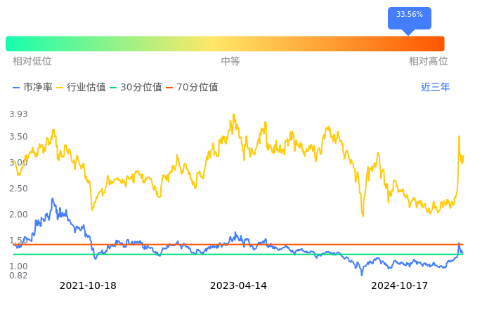 东软集团当前市净率PB为1.28,在所属的IT服务中,市净率PB排7,前五名分别为*ST银江市净率0.41、*ST龙宇市净率0.53、ST智知市净率0.66、千方科技市净率1.15、品高股份市净率1.20。东软集团当前市净率PB为1.26,超过近3年33.56%的历史数据。
