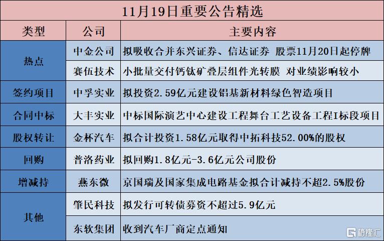 公告精选︱燕东微:京国瑞及国家集成电路基金拟合计减持不超2.5%股份;中金公司:拟吸收合并东兴证券、信达证券 股票11月20日起停牌