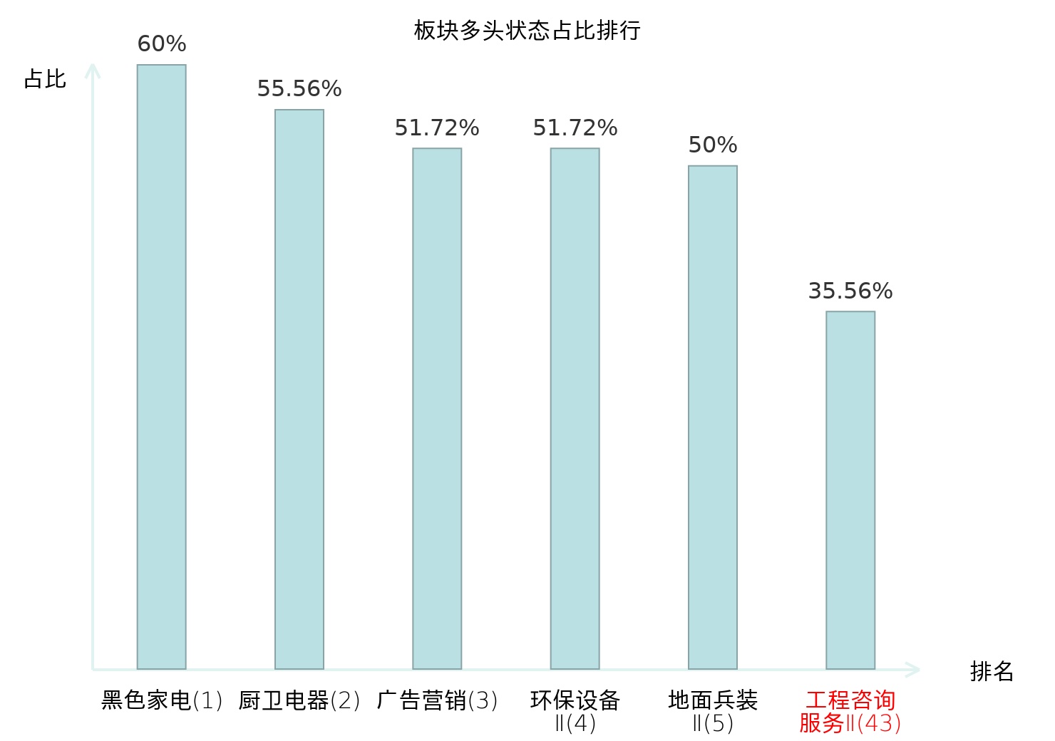 全市场所有行业板块中主力多头状态占比排名中,黑色家电板块位居第一。保险Ⅱ板块名次提升最快,较昨日上升118位。