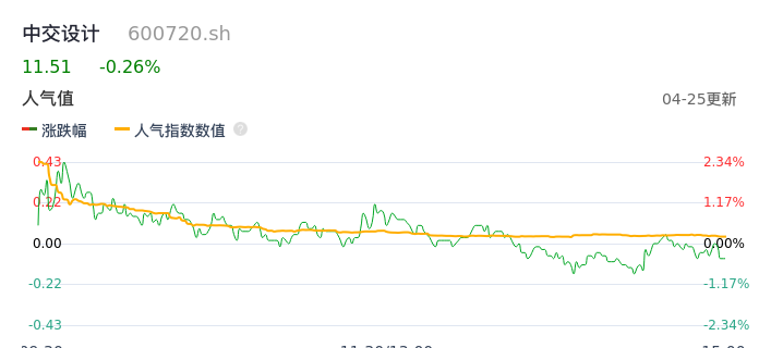 04月25日,中交设计收报11.51,股价涨幅-0.26%,成交金额5.14亿元,换手率5.71%。