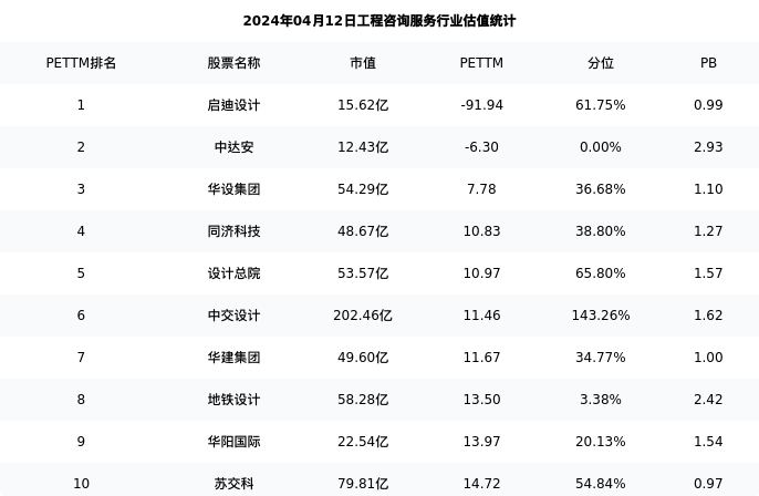 从估值角度看:中交设计最新市盈率PETTM为11.46,在行业内排名4/41,处于143.26分位。