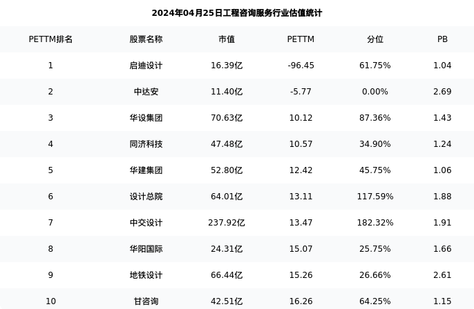 从估值角度看:中交设计最新市盈率PETTM为13.47,在行业内排名5/41,处于182.32分位。