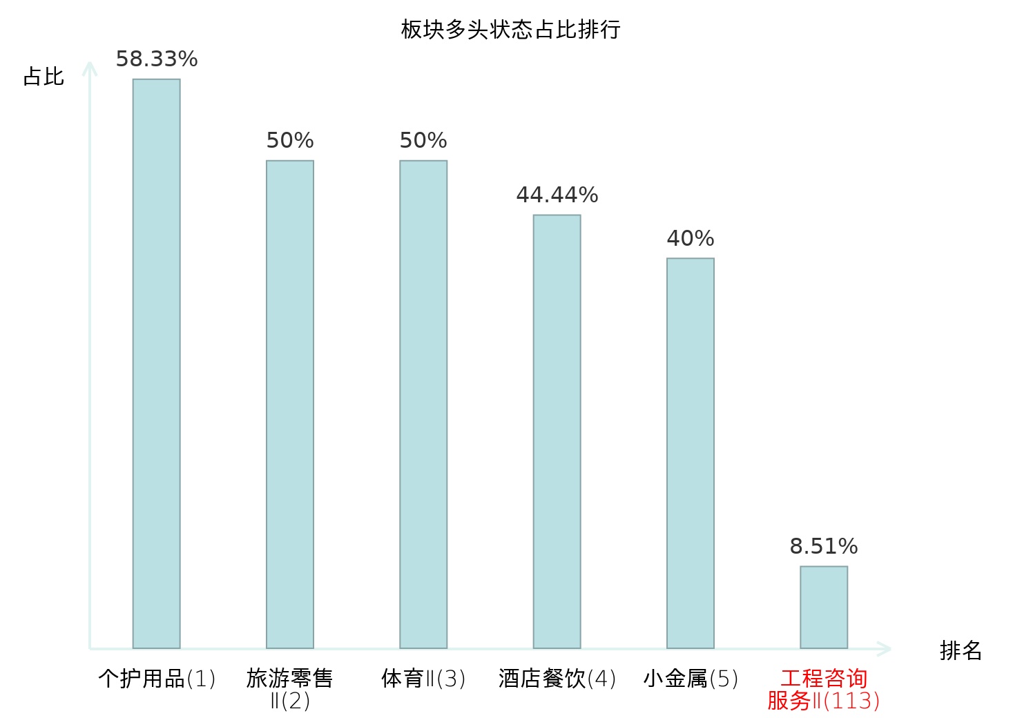 全市场所有行业板块中主力多头状态占比排名中,个护用品板块位居第一。乘用车板块名次提升最快,较昨日上升87位。