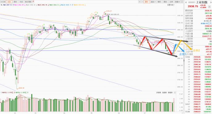 指数方面,沪指来看,今日爆量长阳上涨后,已经来到了2940关口,短期,可能的走势无外乎以下2种,大家可以适当参考:
