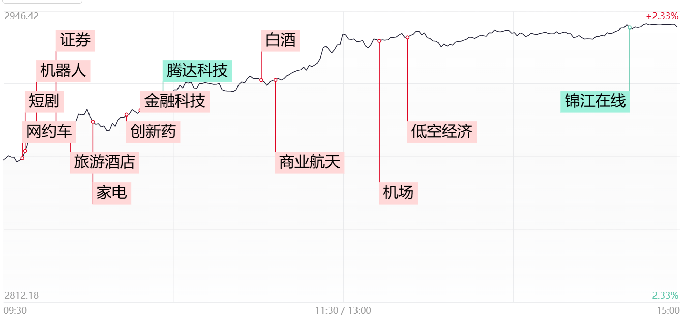 ②盘面上,券商及金融股集体爆发,机器人、医药、低空经济等板块涨幅居前;