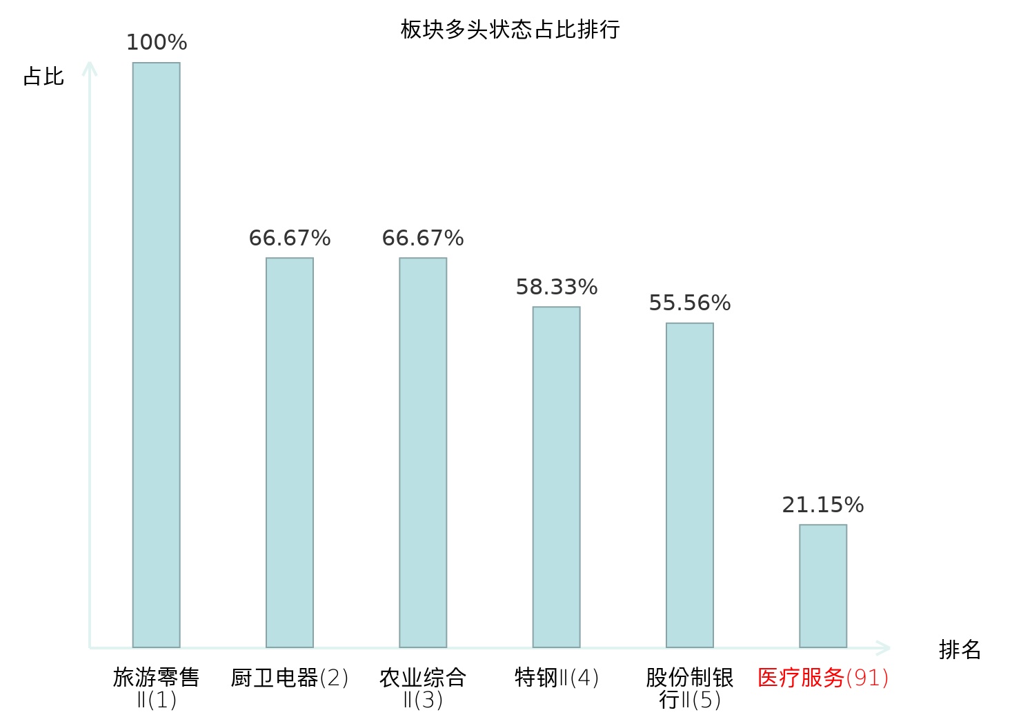 全市场所有行业板块中主力多头状态占比排名中,旅游零售Ⅱ板块位居第一。农商行Ⅱ板块名次提升最快,较昨日上升78位。
