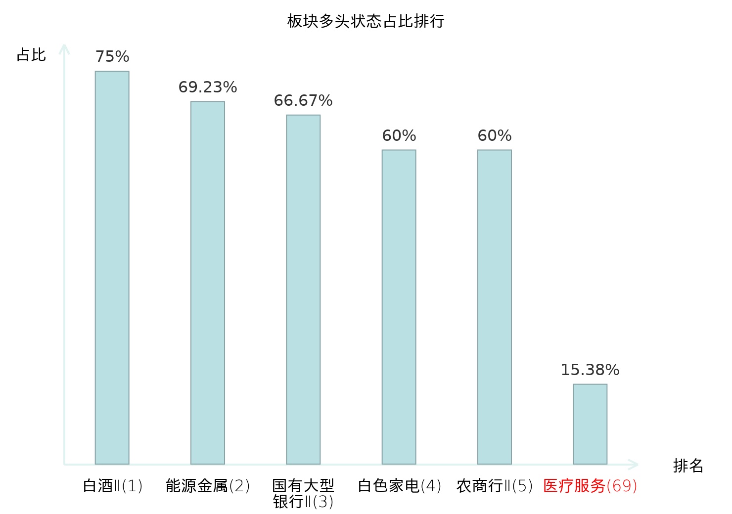 全市场所有行业板块中主力多头状态占比排名中,白酒Ⅱ板块位居第一。房地产服务板块名次提升最快,较昨日上升86位。