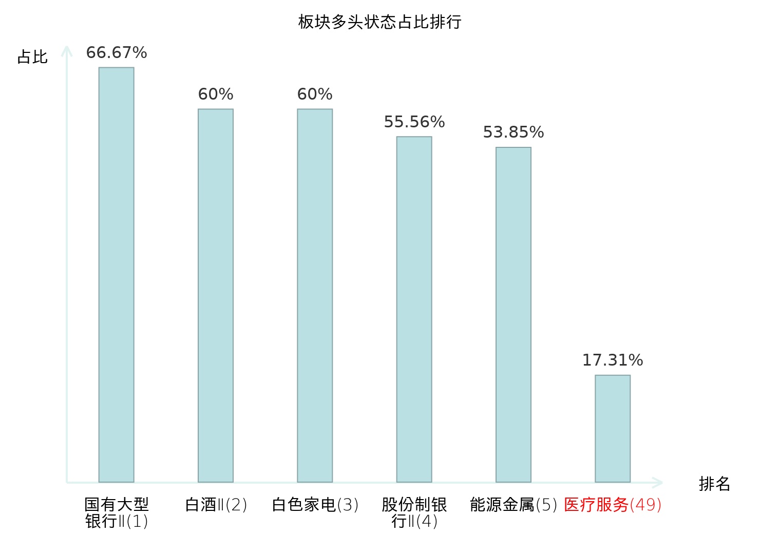 全市场所有行业板块中主力多头状态占比排名中,国有大型银行Ⅱ板块位居第一。电子化学品Ⅱ板块名次提升最快,较昨日上升55位。