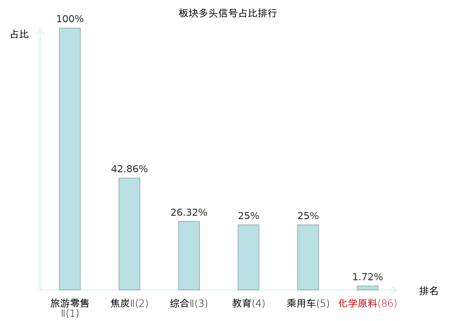 全市场所有行业板块中主力多头信号占比排名中,旅游零售Ⅱ板块位居第一。旅游零售Ⅱ板块名次提升最快,较昨日上升130位。