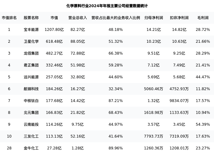 金牛化工最新报告期数据为年报,下表汇总了化学原料行业内市值靠前的公司年报主要经营数据
