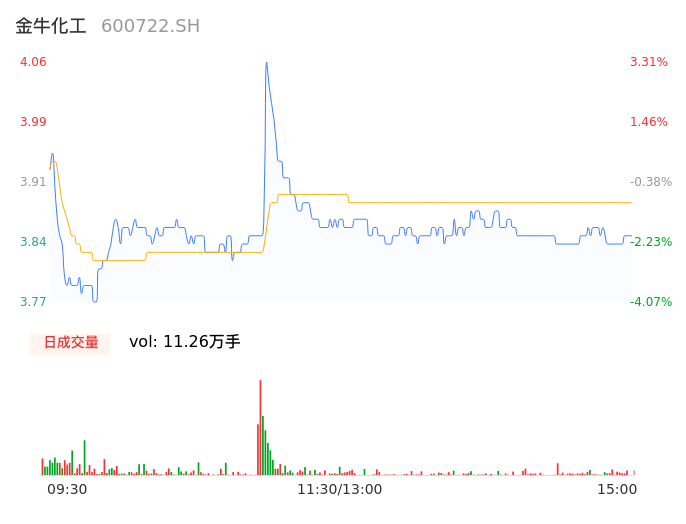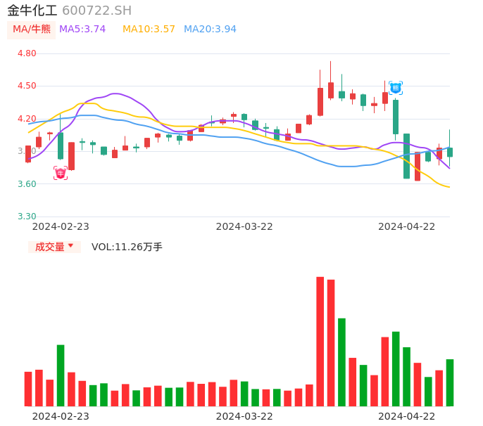 04月22日,金牛化工收报3.85,股价涨幅-2.04%,成交金额4377.25万元,换手率1.66%。