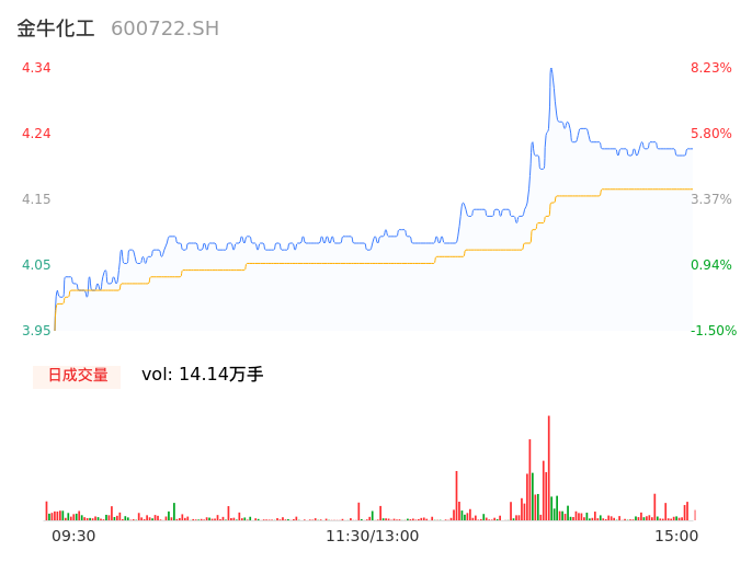 04月29日,金牛化工收报4.23,股价涨幅5.49%,成交金额5884.44万元,换手率2.08%。