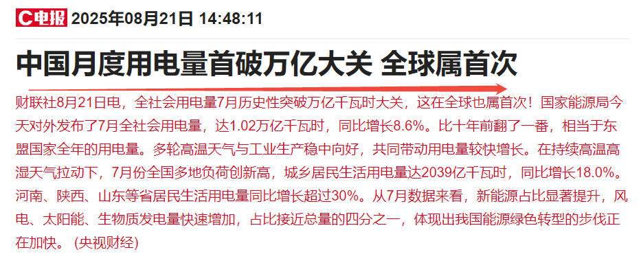 当然还有消息面的助攻,三伏天进入最后的阶段,长江中下游部分地区今后7天高温“全勤”,上海下周要接连一周39度的高温炙烤,收盘前的消息月度用电量更是首次突破万亿大关,在高温和人工智能大力发展的背景下,电力的消耗增加,考虑到行情轮动特征,那么电力还是可以关注的。