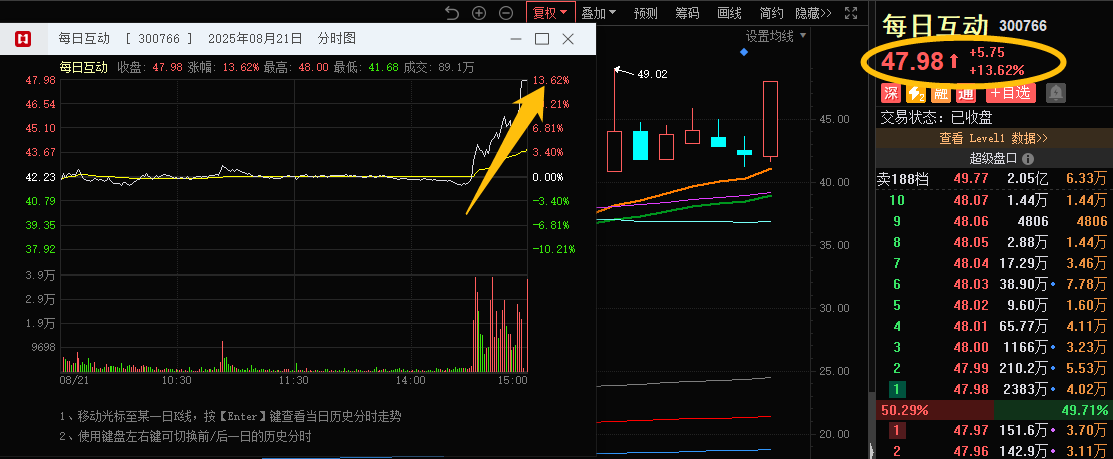 尾盘跳水阶段,AI应用deepseek概念龙头股每日互动发力水下快速拉升涨超13%+,而前期热炒的AI应用人气股吉视传媒跌停板被拉起来,截止收盘吉视传媒地天板。很明显是主力资金要拉情绪,改变市场疲软的局面。