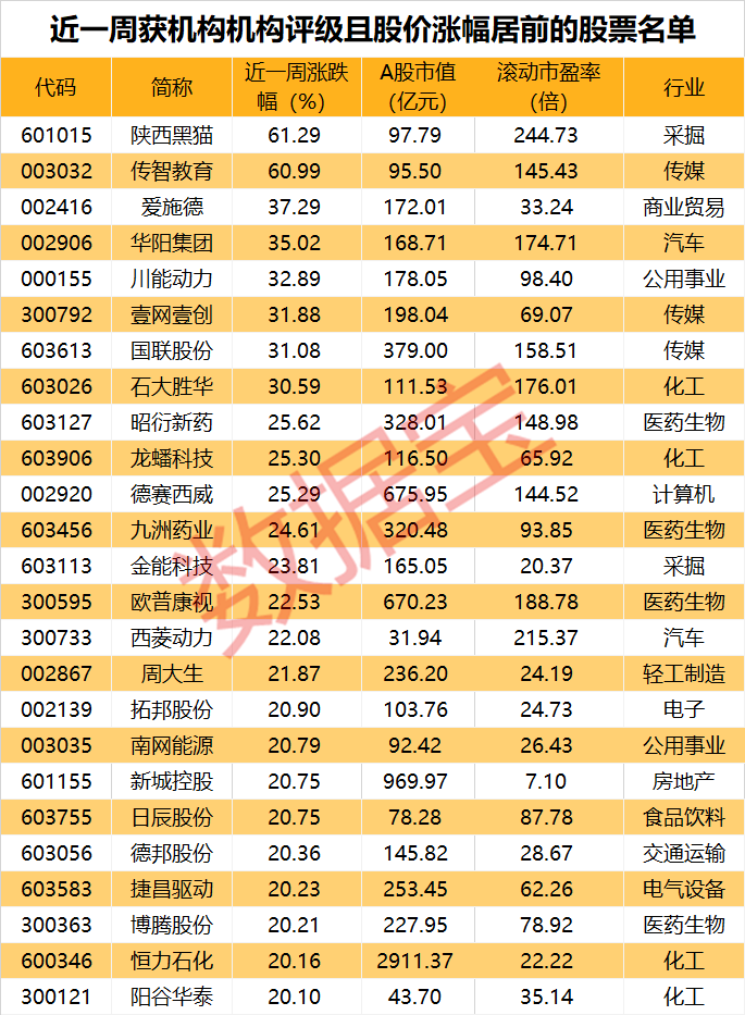 25只获买入型评级的股票股价周累计上涨幅度超20%,其中有8只股价周累计上涨幅度超30%,分别是陕西黑猫、传智教育、爱施德、华阳集团、川能动力、壹网壹创、国联股份和石大胜华。