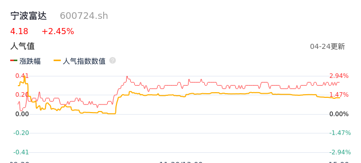 04月24日,宁波富达收报4.18,股价涨幅2.45%,成交金额2770.03万元,换手率0.46%。