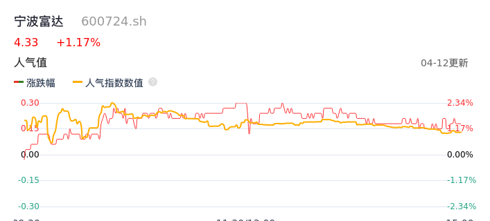 04月12日,宁波富达收报4.33,股价涨幅1.17%,成交金额3969.23万元,换手率0.63%。