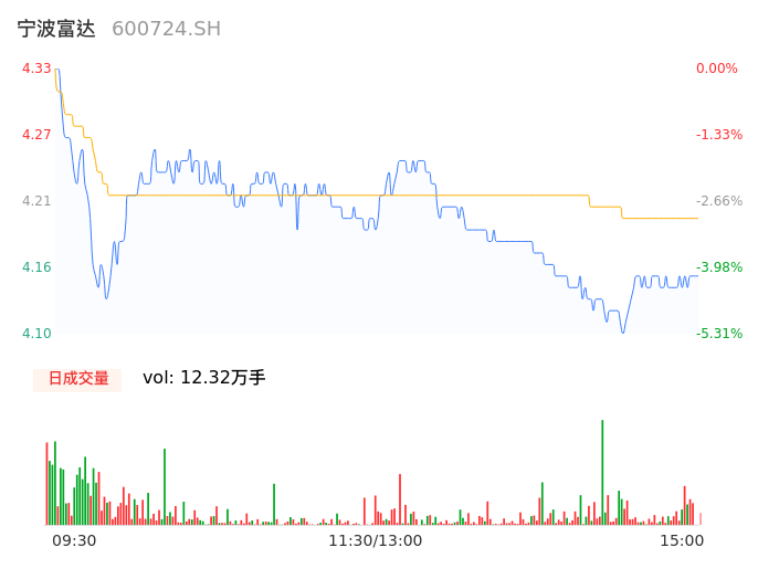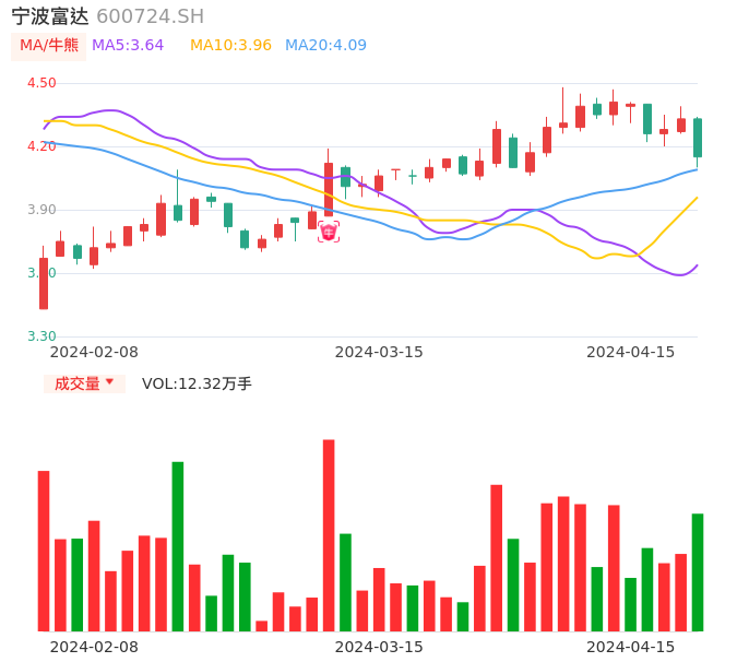 04月15日,宁波富达收报4.15,股价涨幅-4.16%,成交金额5173.59万元,换手率0.85%。