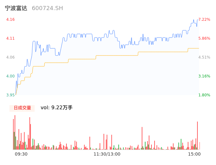 04月17日,宁波富达收报4.16,股价涨幅7.22%,成交金额3764.02万元,换手率0.64%。