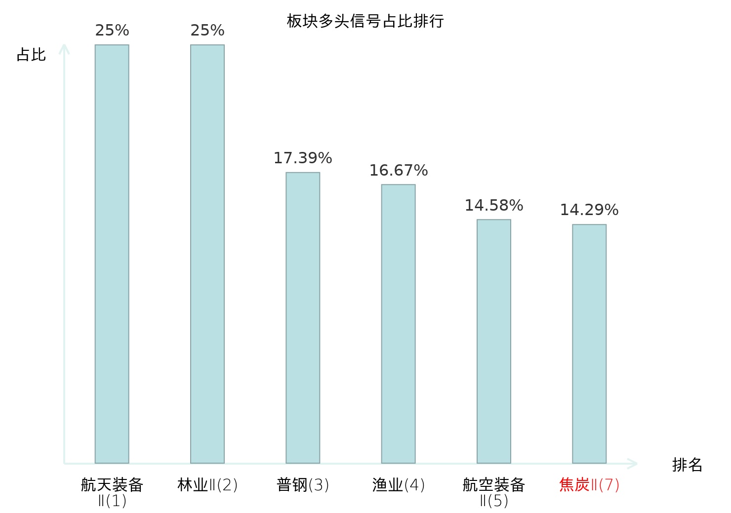全市场所有行业板块中主力多头信号占比排名中,航天装备Ⅱ板块位居第一。林业Ⅱ板块名次提升最快,较昨日上升124位。