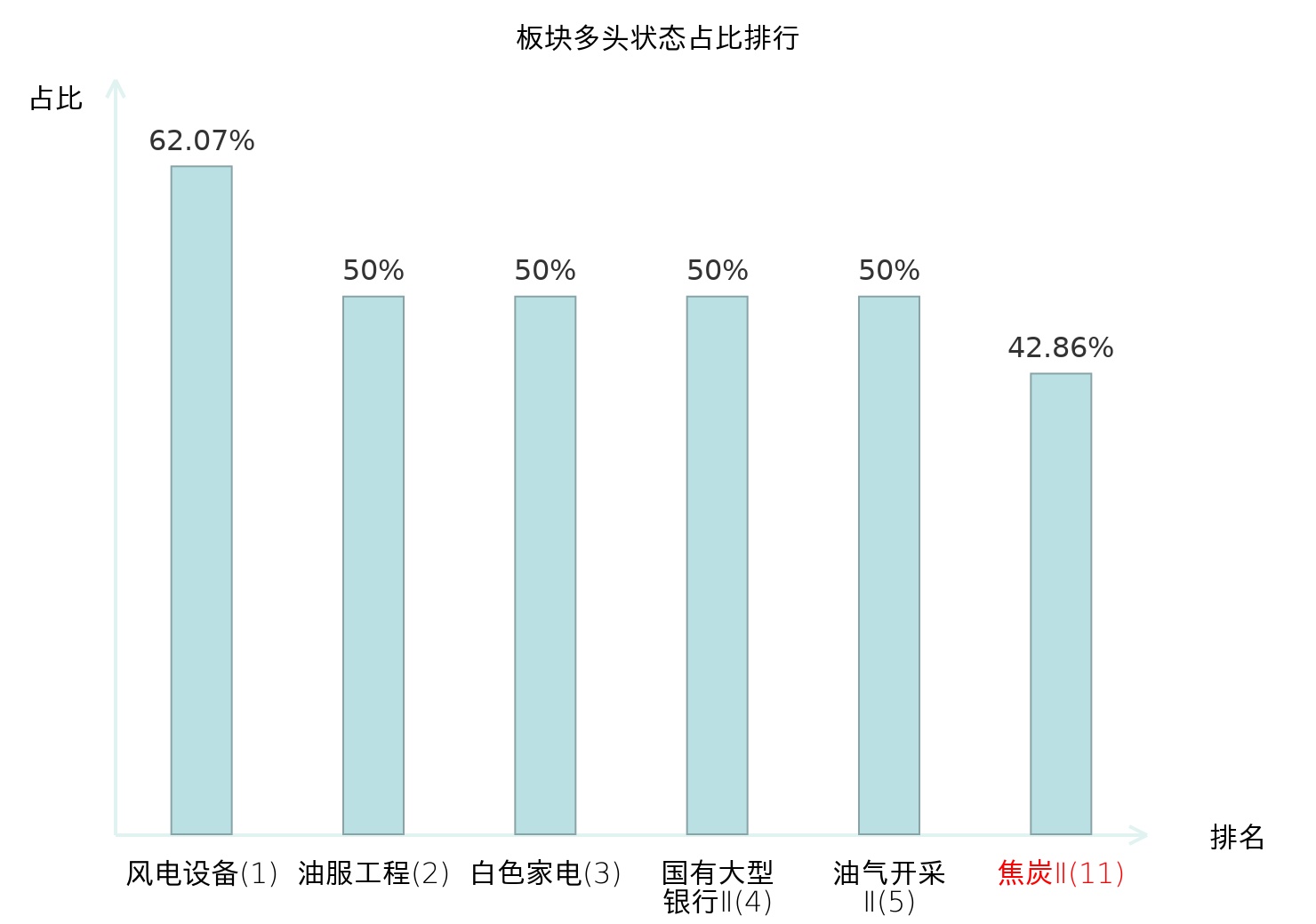全市场所有行业板块中主力多头状态占比排名中,风电设备板块位居第一。动物保健Ⅱ板块名次提升最快,较昨日上升64位。