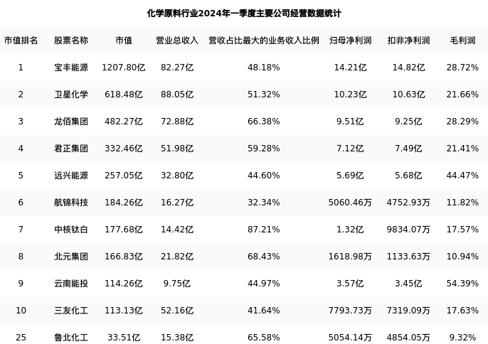 鲁北化工最新报告期数据为一季度,下表汇总了化学原料行业内市值靠前的公司一季度主要经营数据
