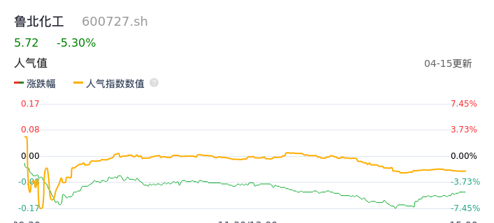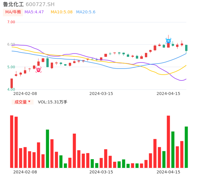 04月15日,鲁北化工收报5.72,股价涨幅-5.30%,成交金额8811.74万元,换手率2.90%。