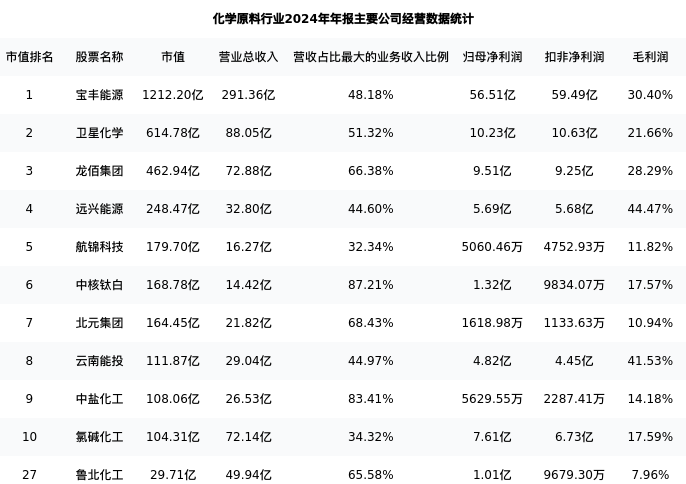 鲁北化工最新报告期数据为年报,下表汇总了化学原料行业内市值靠前的公司年报主要经营数据