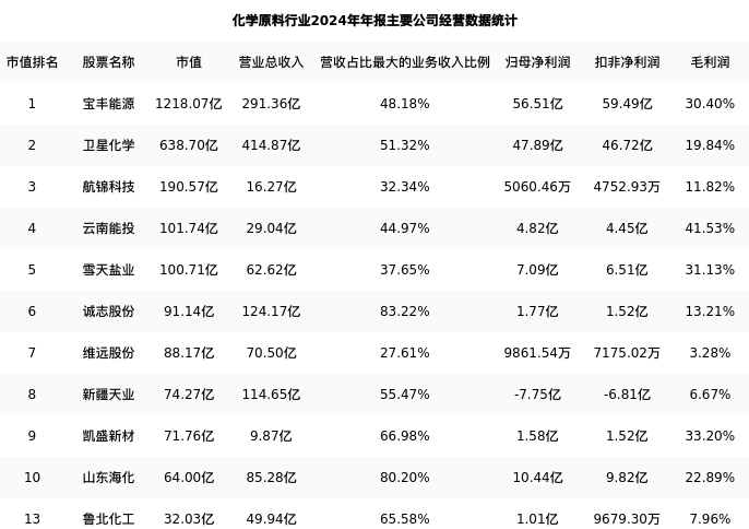 鲁北化工最新报告期数据为年报,下表汇总了化学原料行业内市值靠前的公司年报主要经营数据