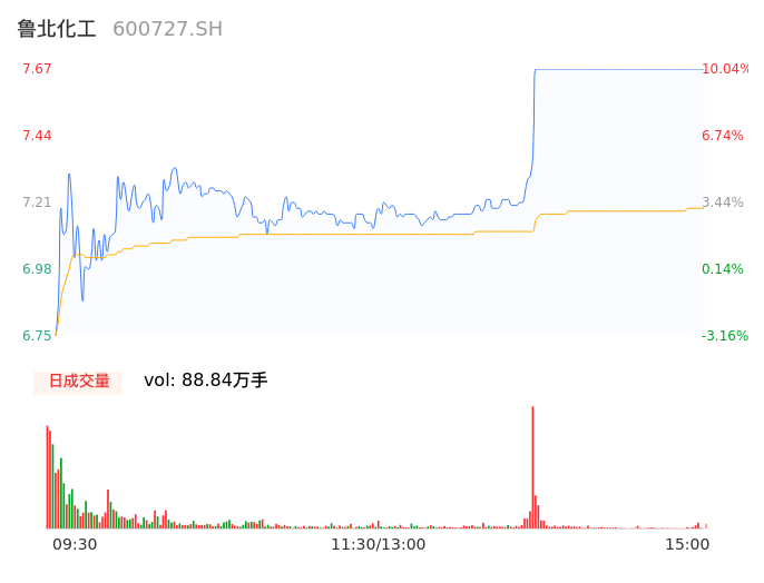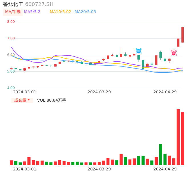 04月29日,鲁北化工收报7.67,股价涨幅10.04%,成交金额6.39亿元,换手率16.81%。