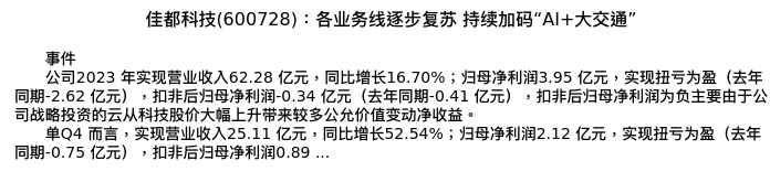 值得注意的是:2024年04月浙商证券的刘雯蜀/刘静一/张致远分析师,首次发布关于佳都科技的研究报告,标题为:佳都科技(600728):各业务线逐步复苏 持续加码“AI+大交通”。