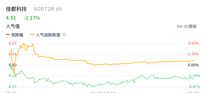 04月30日,佳都科技收报4.51,股价涨幅-2.17%,成交金额1.69亿元,换手率1.76%。