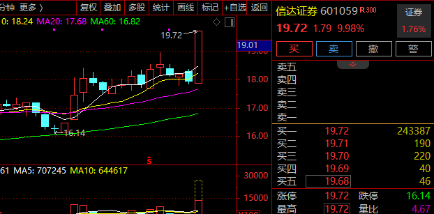 值得注意的是,券商股再度走高,信达证券涨停,光大证券涨逾7%,东兴证券、中国银河、东方财富等跟涨。