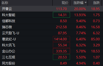 上证报中国证券网讯 8月27日早盘,人工智能板块表现强势,截至9时46分,开普云涨停,收获3连板,科大智能涨逾13%,佳都科技、瑞芯微、云天励飞、寒武纪等跟涨。
