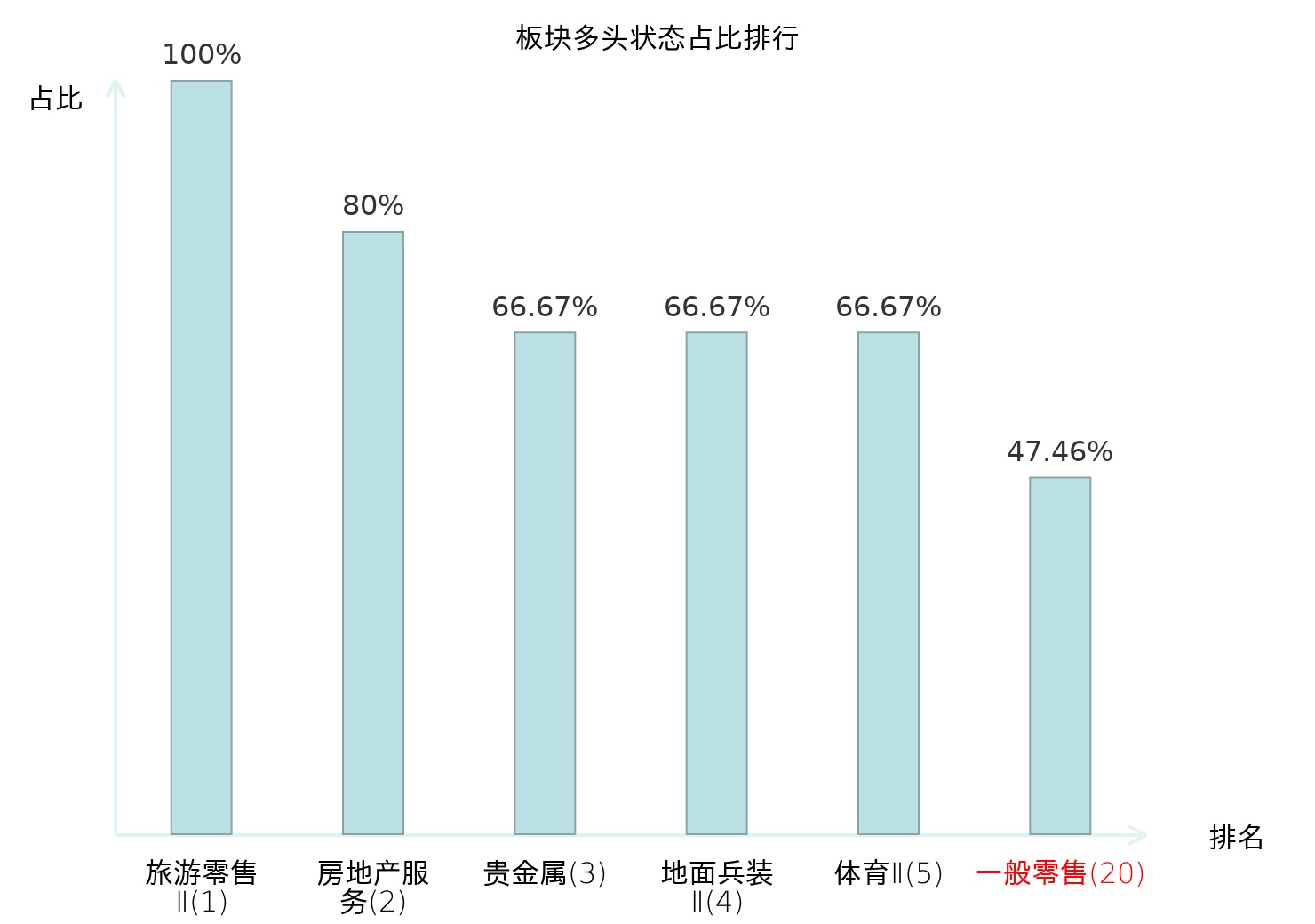 全市场所有行业板块中主力多头状态占比排名中,旅游零售Ⅱ板块位居第一。个护用品板块名次提升最快,较昨日上升70位。